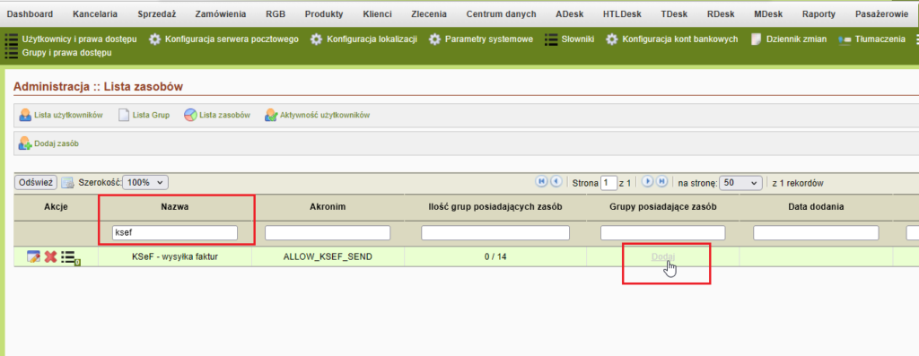 - dodać zasób “KSeF – wysyłka faktur” do wybranych grup użytkowników (można go dodać do jednej lub do wielu grup)