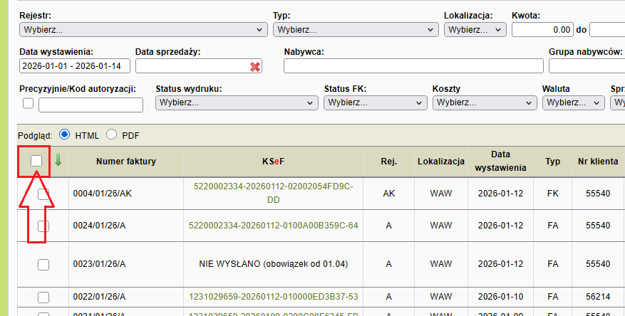 Przypominamy, że aby zaznaczyć jednym kliknięciem wszystkie widoczne na liście faktury, należy kliknąć na kwadracik (check-box) znajdujący się w wierszu z nagłówkami kolumn, na lewo od kolumny Numer faktury