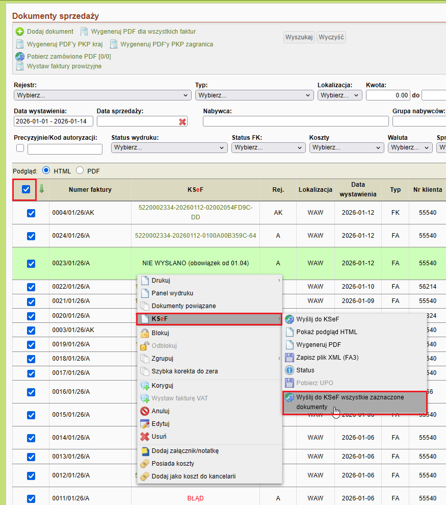 Aby jednocześnie wysłać do KSeF wiele faktur, należy je wyszukać, zaznaczyć, a następnie nacisnąć prawy klawisz myszy i wybrać: KSeF -> Wyślij do KSeF wszystkie zaznaczone dokumenty.