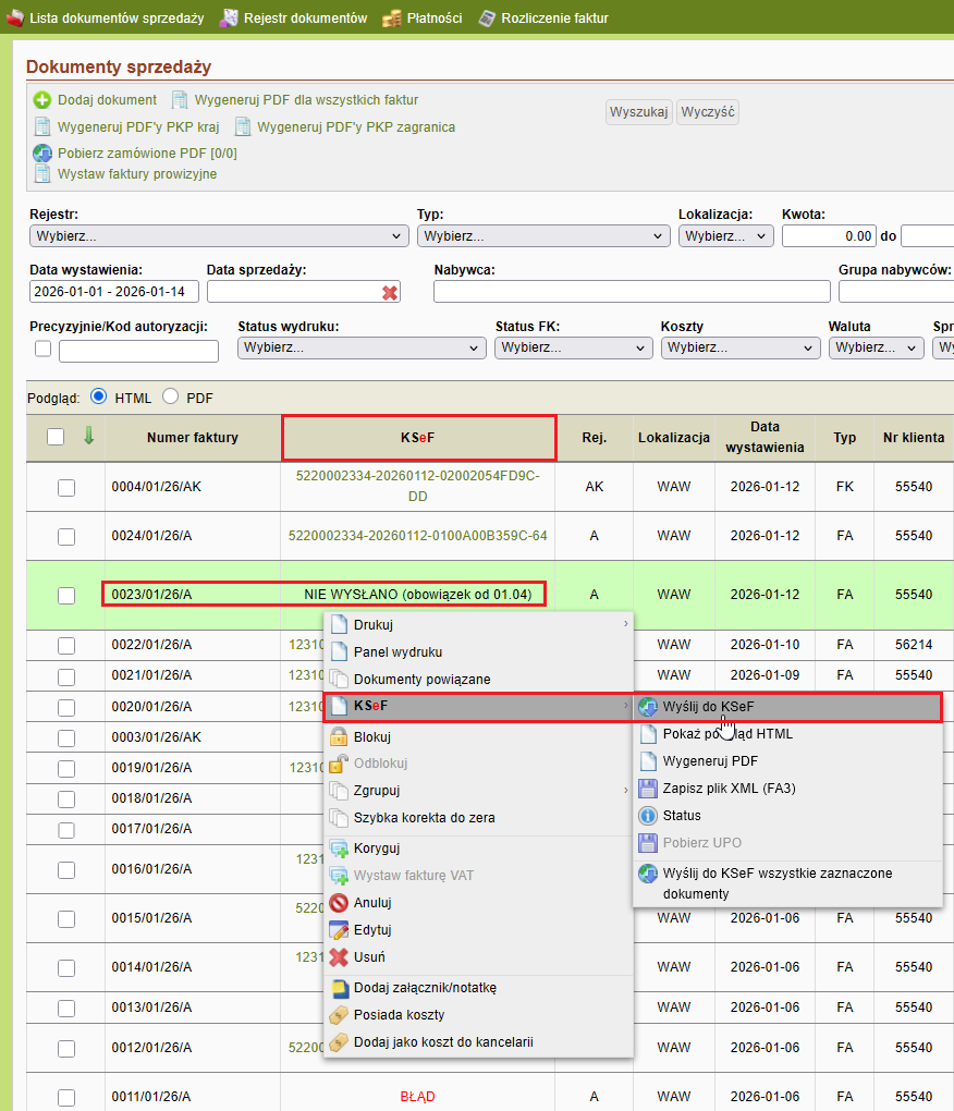 Po odświeżeniu strony w kolumnie KSeF pojawią się numery faktur nadanych przez KSeF, lub informacje o błędach – jeśli takie wystąpią.