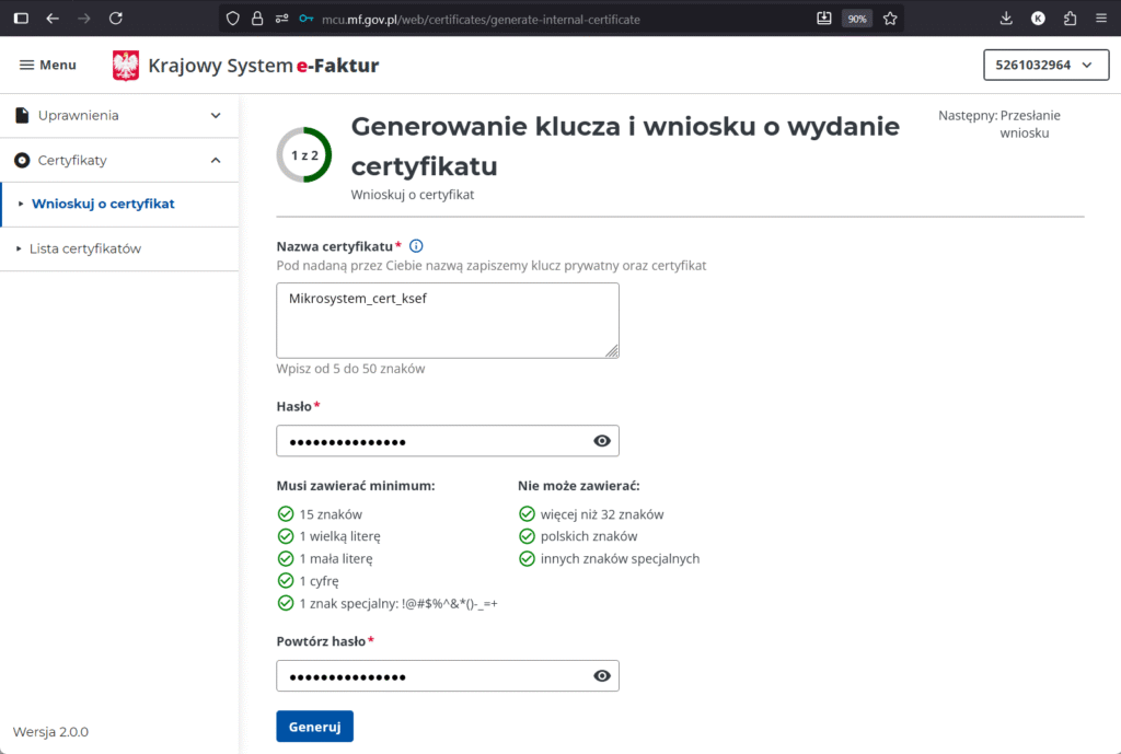 Uwaga: Zapisz to hasło poza przeglądarką (na przykład w pliku tekstowym). Będzie ono potrzebne w czasie ładowania utworzonego certyfikatu do eKNF.