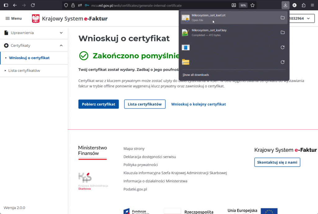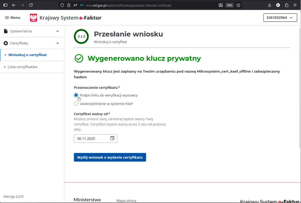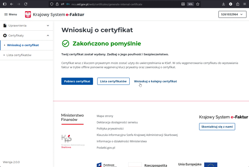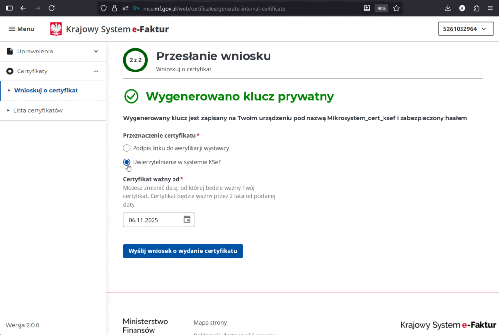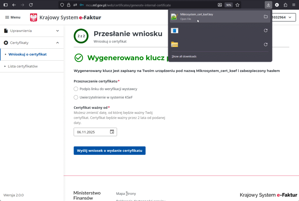 Pierwszy certyfikat będzie służył do uwierzytelniania w systemie KSeF i przesyłania faktur.