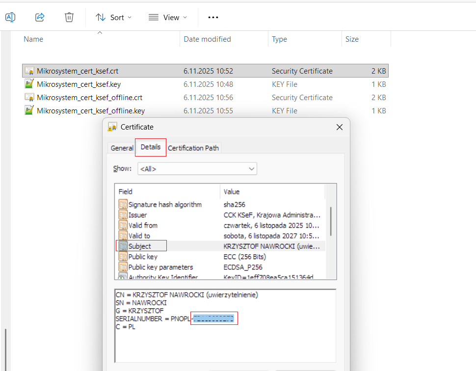 Sposób generowania certyfikatów na potrzeby eKNF opisaliśmy w poprzednim rozdziale. Jeśli wykonałeś/wykonałaś już ten krok, możesz sprawdzić, który identyfikator został tam zaszyty: NIP czy PESEL.