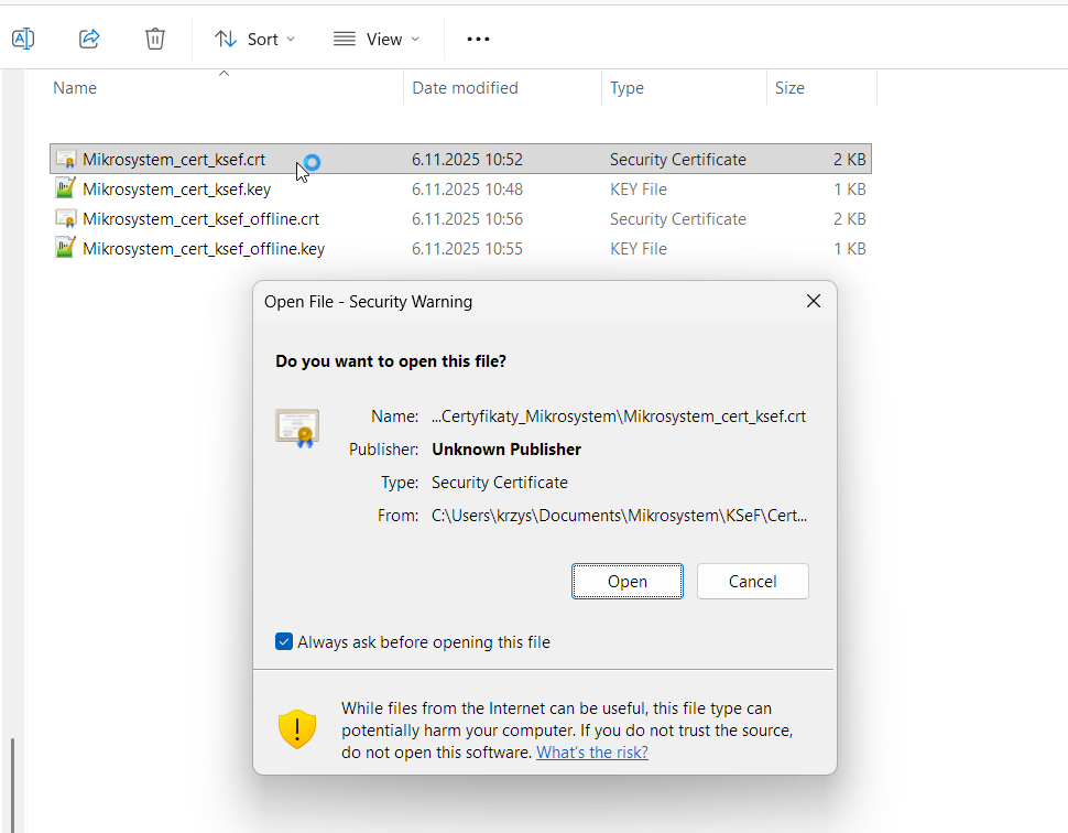 Wejdź do katalogu, w którym zapisane zostały utworzone certyfikaty i kliknij dwukrotnie na jeden z plików z rozszerzeniem .crt